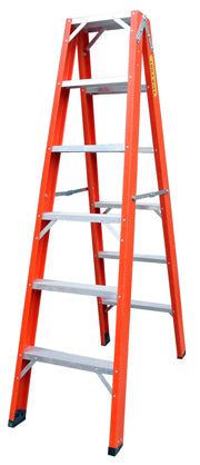 Escada dupla com montantes de fibra e degraus de alumínio estriados, com largura de 75mm, sapatas de borracha nos pés. Devido a suas características tem uma ampla utilidade industrial e comercial. São leves, resistentes a intempéries.